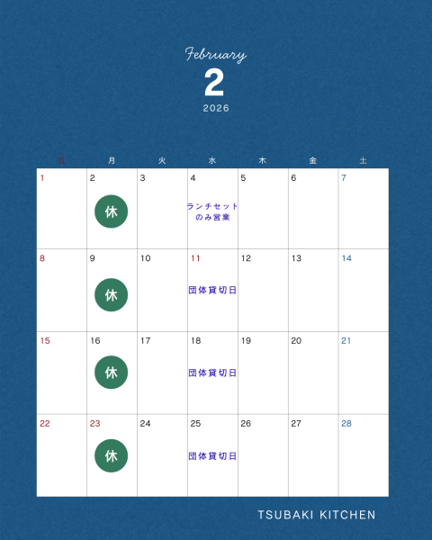 > レストラン店休日のお知らせ(2月)